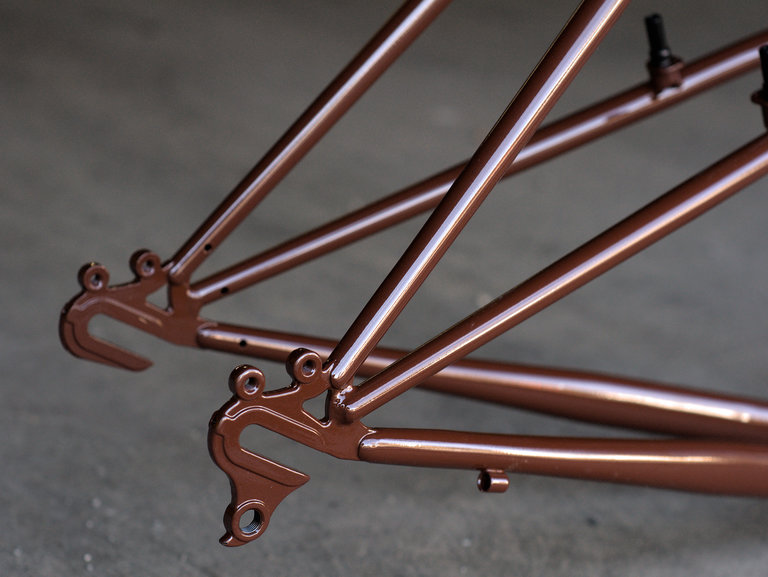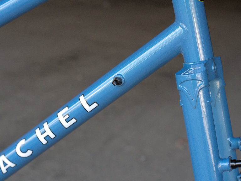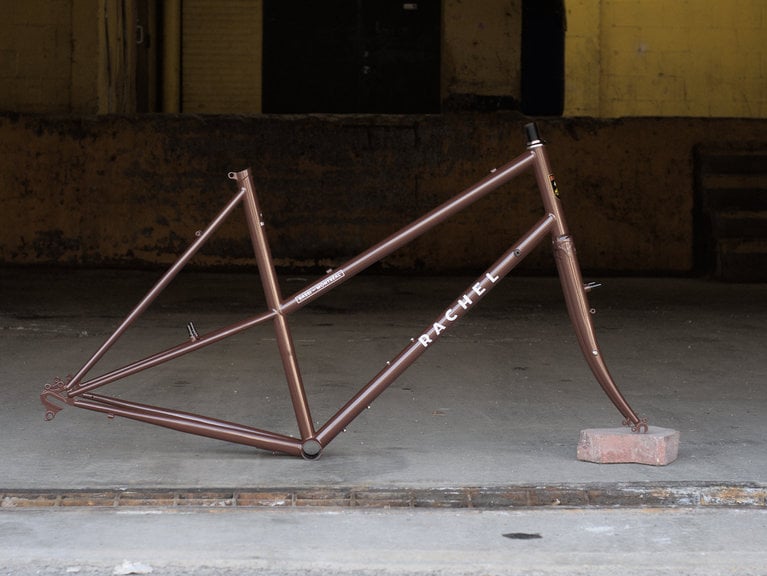 Our beautiful Rachel step-through frame, named for the street where our flagship store is located, is back with a few improvements! Some people were using their original-run Rachels for full-on four-pannier international touring, and while the original spec was just fine for such endeavours, we decided to make some changes to make such adventures a bit easier: beefed-up tubing, more tire clearance, longer wheelbase and raised front-end for more comfort, and a few new eyelets here and there. Revised with slightly longer reach in 2023, for better comfort with swept-back handlebars.