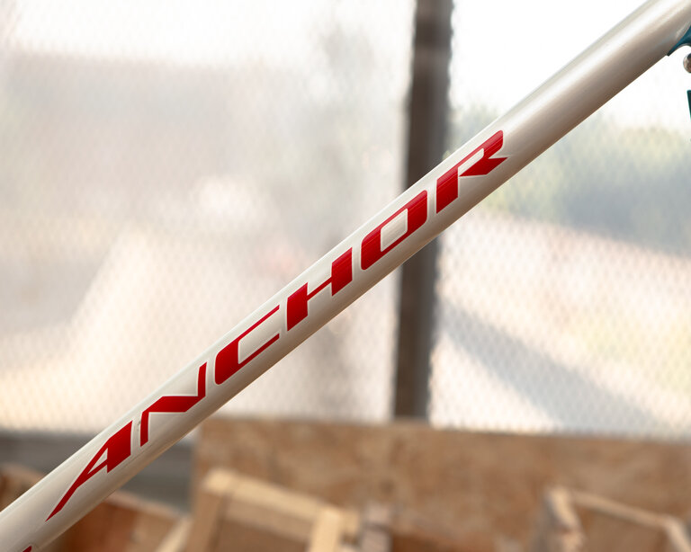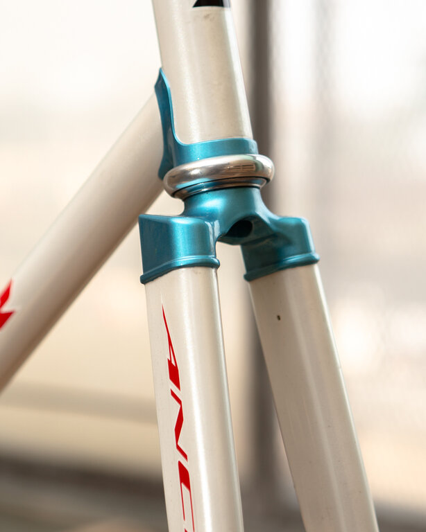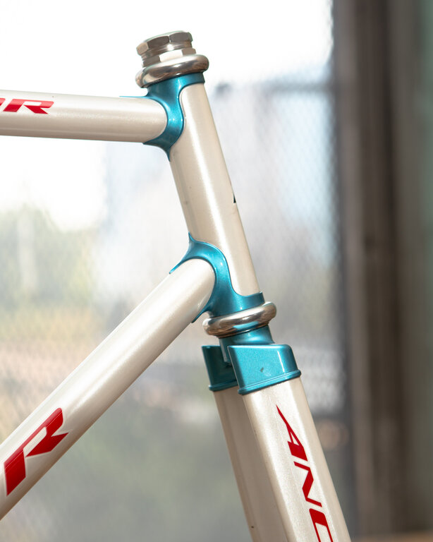 This one is a lugged Anchor NJS 54cm in white. It has a few cosmetic blemishes and a very slight dent on the underside of the top tube near the head tube junction.