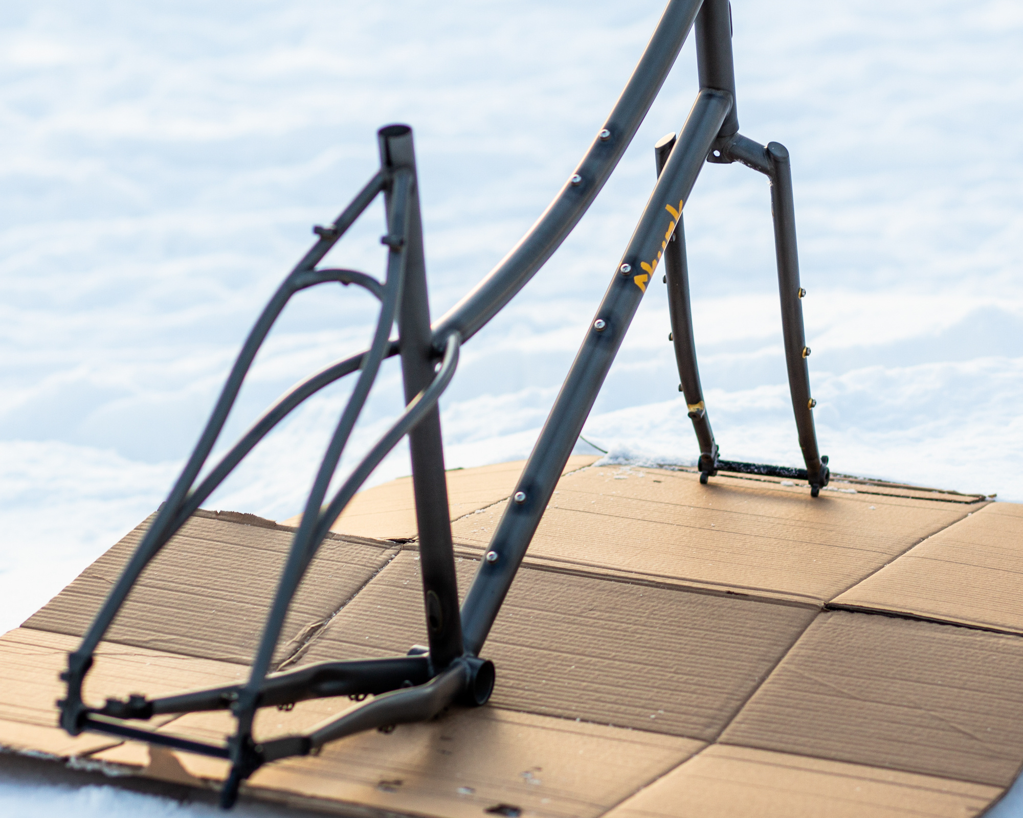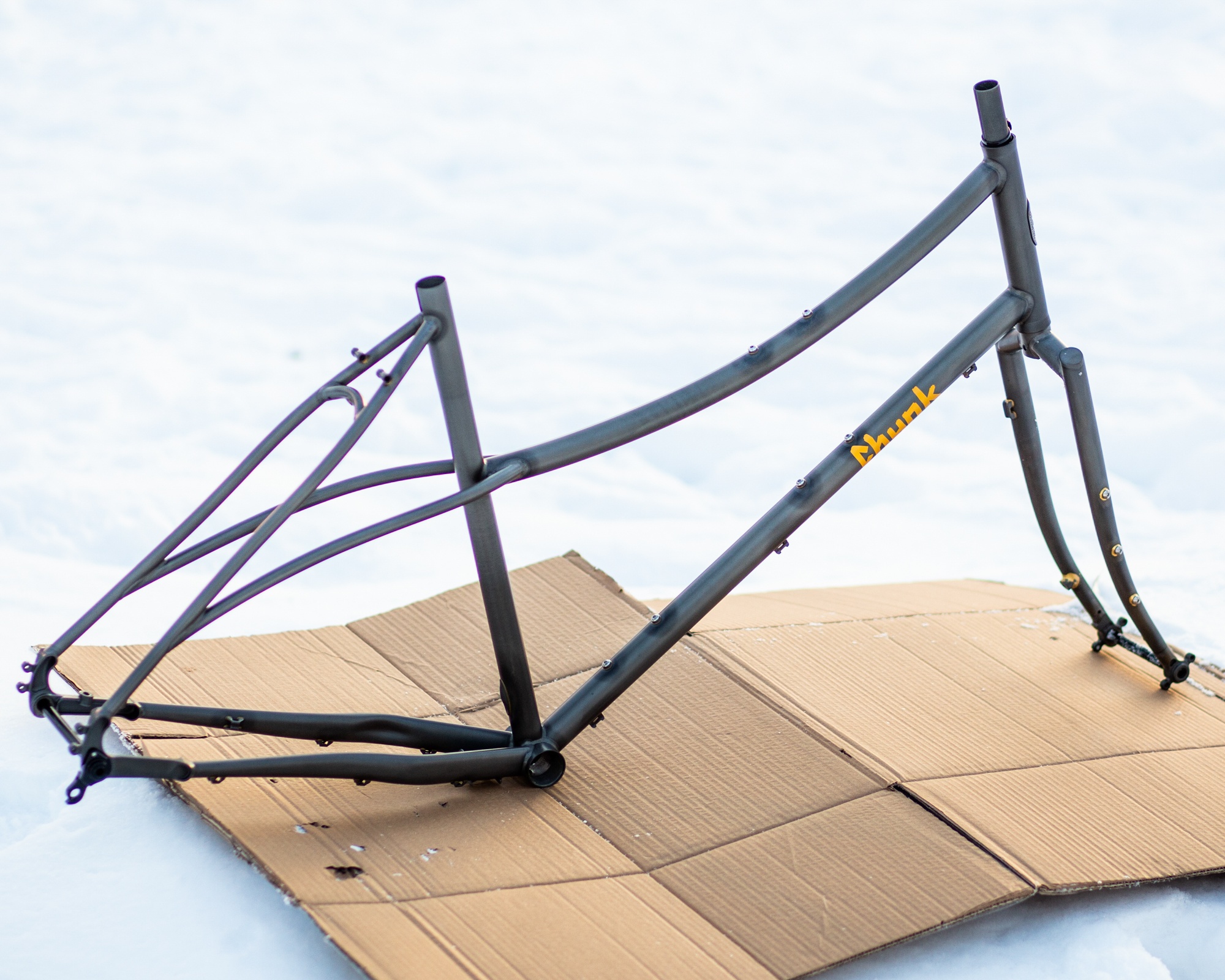 On a brièvement aperçu le prototype du Chunk à Keita chez Crumbworks en mars 2023, et depuis ce temps on garde un oeil sur son développement et lancement! C'est un cadre incroyable qui jumèle nouveaux et anciens standards, a des tubes courbés très élégants, et roule parfaitement. Le Chunk original est fait sur commande au Japon par Raizin Works. Le Farets Chunk est une version plus accessible fabriquée à Taïwan.