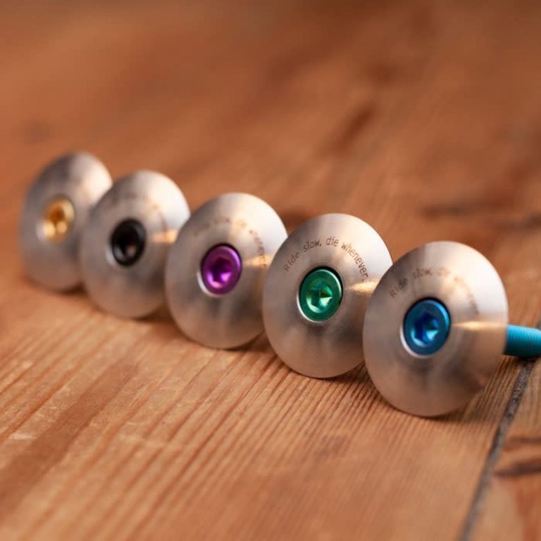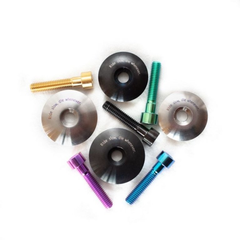 Haut de direction en titane brut avec boulon en titane anodisé.