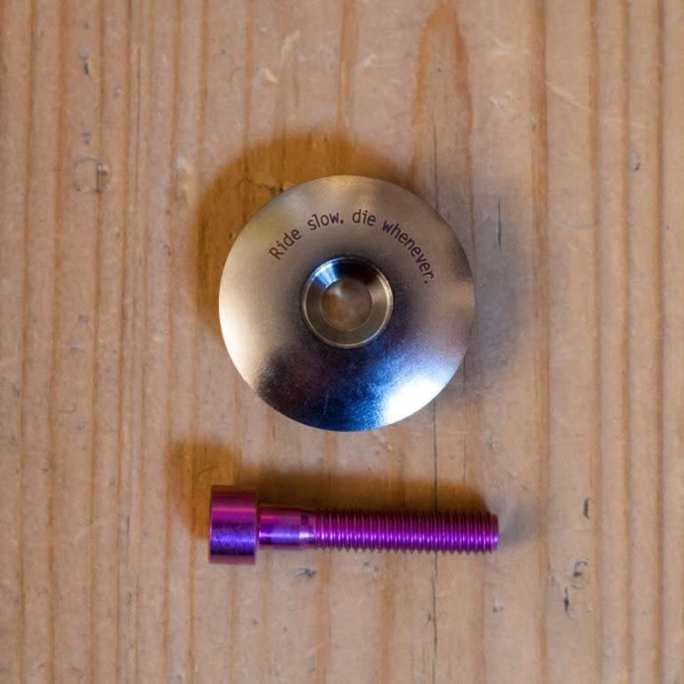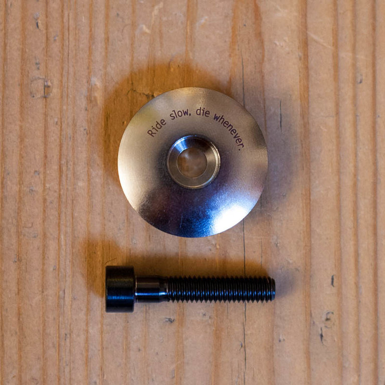 "Ride slow, die whenever" gravé au laser en très petit.