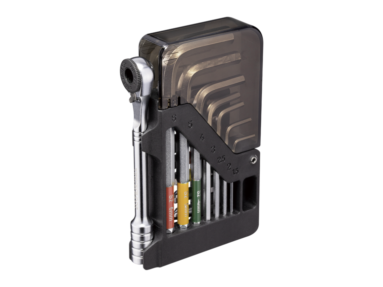 Une trousse d'outils incroyablement compacte 15 fonctions avec un ensemble de clés hexagonales à bout sphérique. 7 mèches de cliquet et 7 clés hexagonales s'organisent dans un porte-outil pliable facile à ranger.