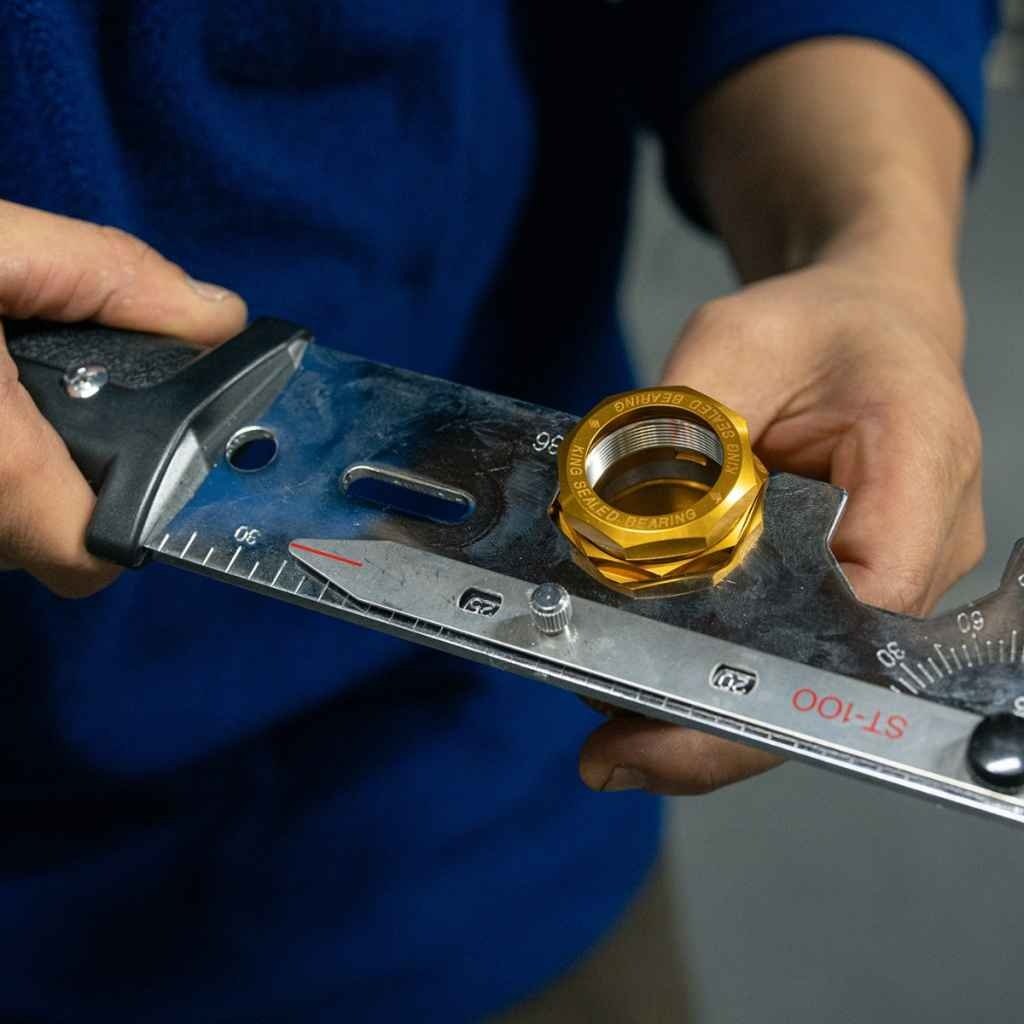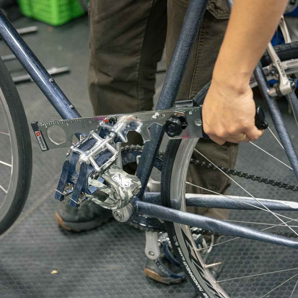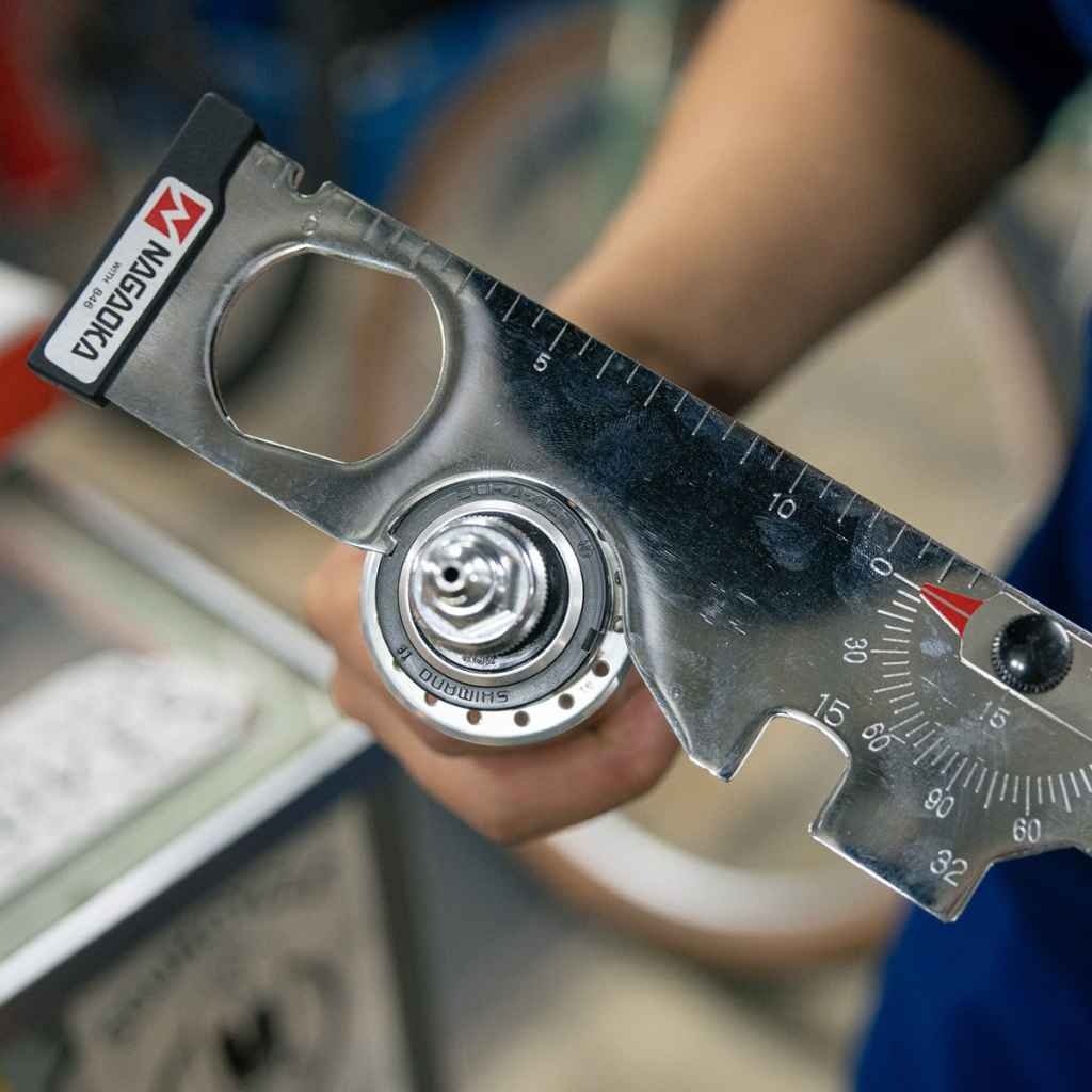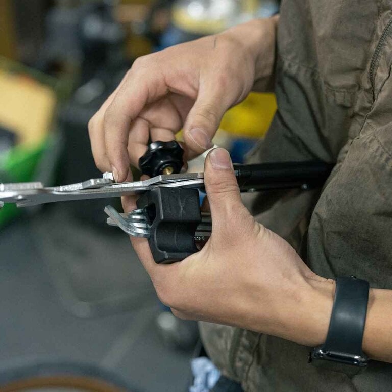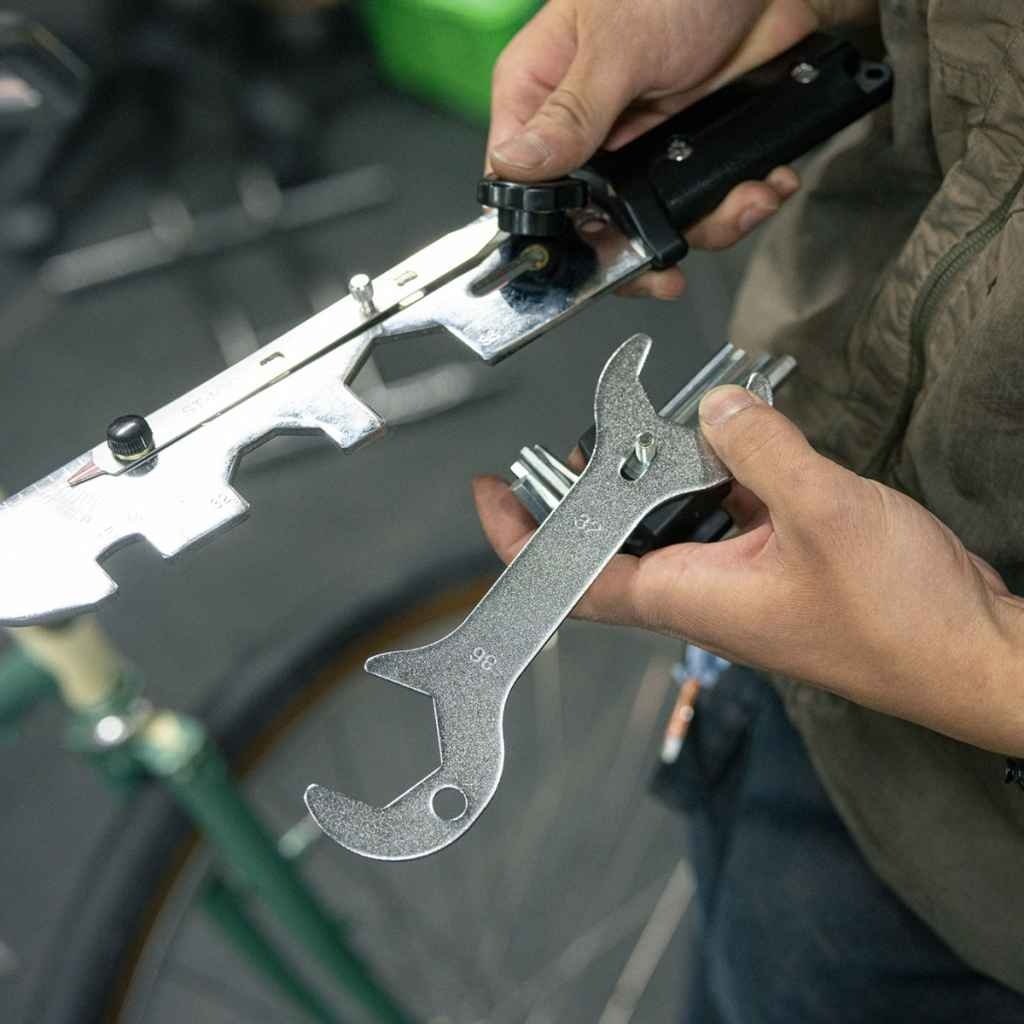 Clé à jeu de direction (32/36 mm), clé à moyeu (15 mm), clé à écrou de serrage, jauge d'angle, échelle, mesure de rayons. Il sert également de support pratique pour les réparations, et vient avec des clés hex.