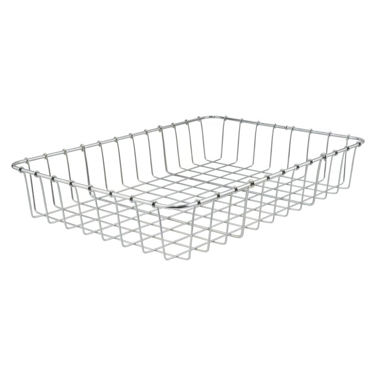 • 18″L x 13″P x 6″H – le panier rétrécit à 15 3/4″ x 10 1/2″ au fond. Le demi fait 3po de profondeur.
