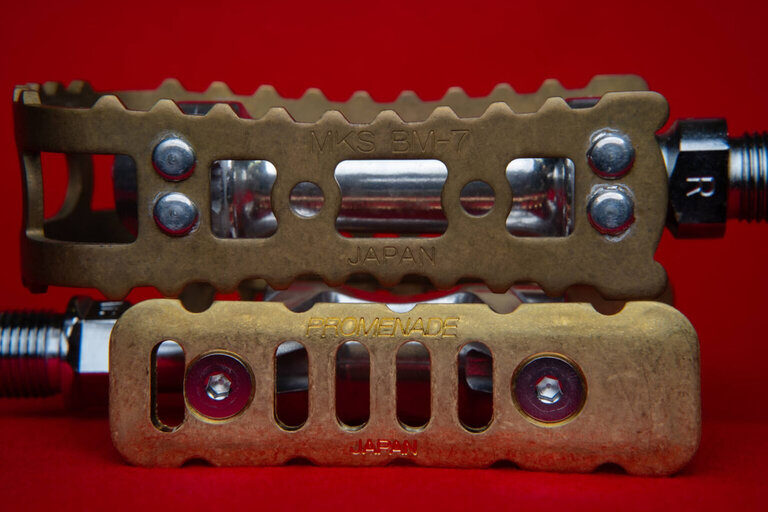 La pédale MKS Promenade est une version moderne d'un design classique. En utilisant des côtés et un corps en alliage, la Promenade est environ 40 grammes de plus légère que des pédales semblables comme la Sylvan Stream. La cage courbée est plus forte pour des cyclistes puissants, et a un profil de dents bas et larges avec des coins ronds.