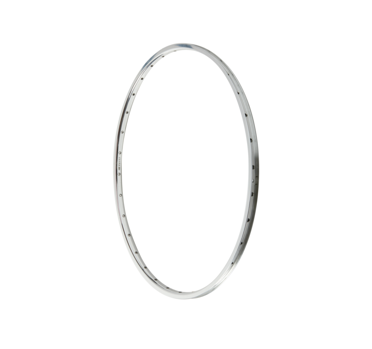 Une jante classique au profil carré, en aluminium poli avec oeillets rivetés.