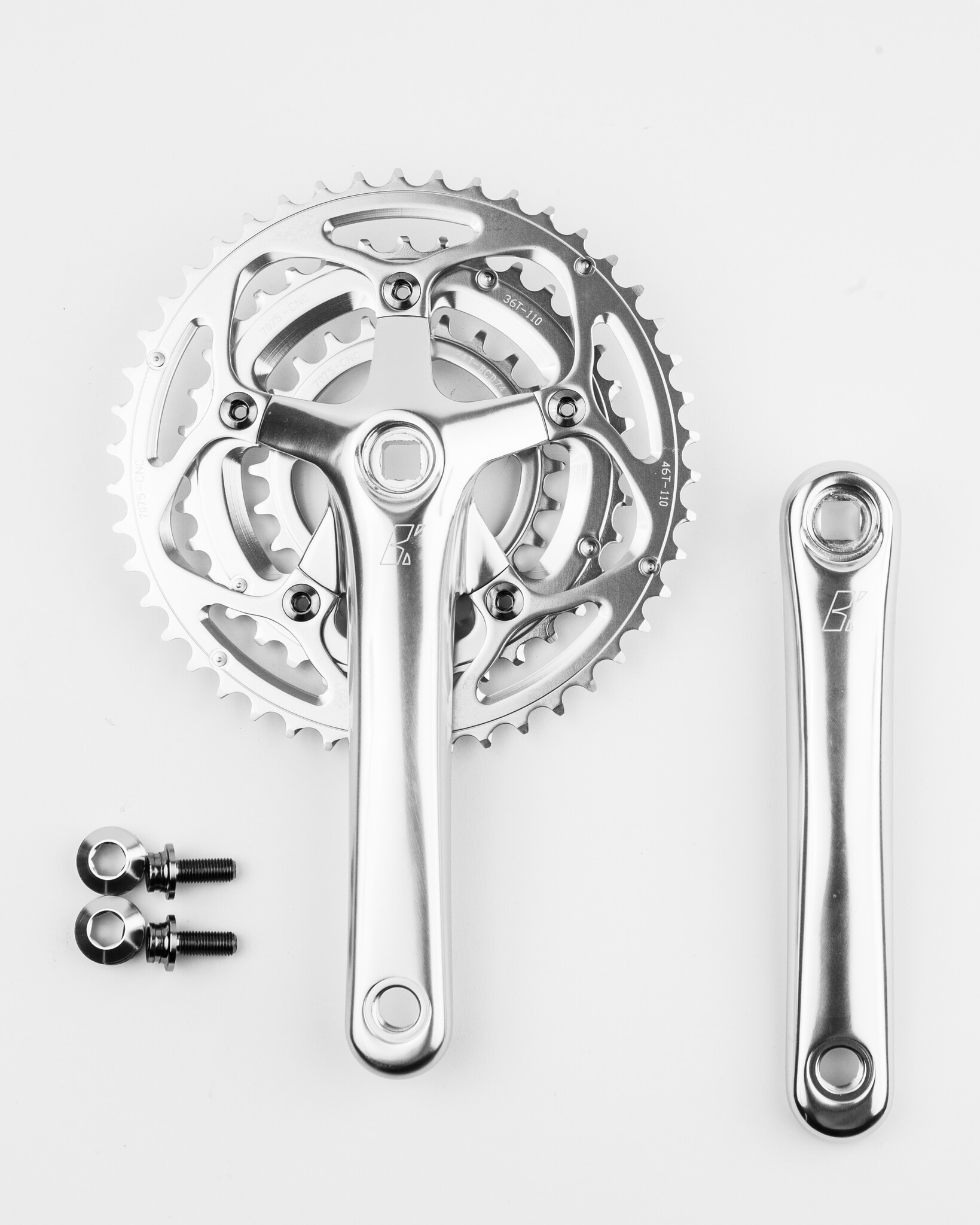 C’est le pédalier idéal pour les amateurs de grimpe et de longue journée de cyclisme. On utilise ici le même concept qu’avec notre pédalier double compact, mais en y ajoutant un plateau de 24 dents. Une belle combinaison de plateaux de 46-34-24d qui permet de toujours rouler sans trop forcer peu importe le dénivelé. Honnêtement, ça ouvre l’éventail d’options de ratios dans la transmission. Un dérailleur arrière à longue cage aura normalement une capacité pour un grand pignon de 34d avec ce pédalier, ample pour grimper même avec des bagages.